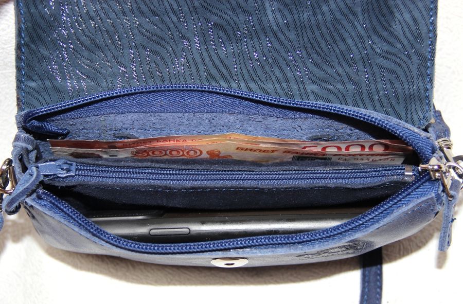 Внутри сумочки три отделения, одно из них под молнией. Небольшой кармашек для карточек.