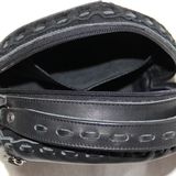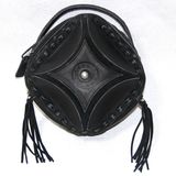 Сумочка изготовлена из толстой плотной кожи матового чёрного цвета.